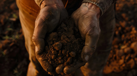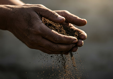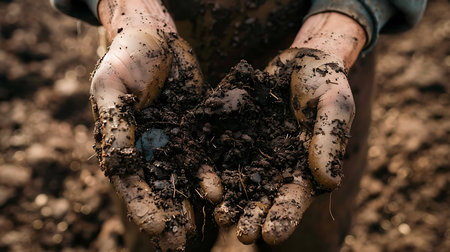 Close-up of hands holding a handful of rich, fertile dirt, symbolizing agriculture and connection to nature.