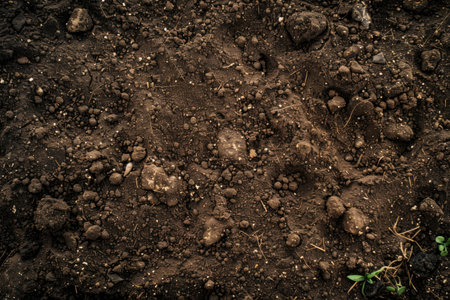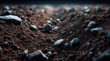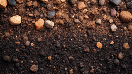 A captivating close-up of rich, dark soil mixed with pebbles, perfect for showcasing the beauty of nature's earth. Ideal for gardening and landscaping themes.