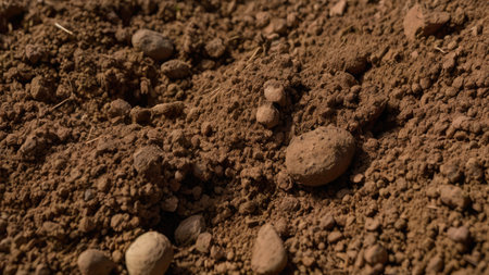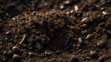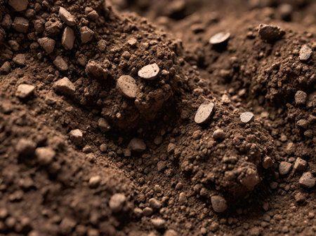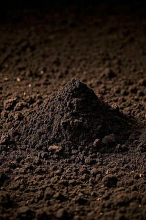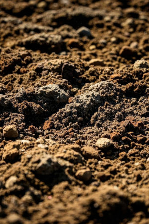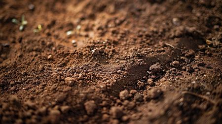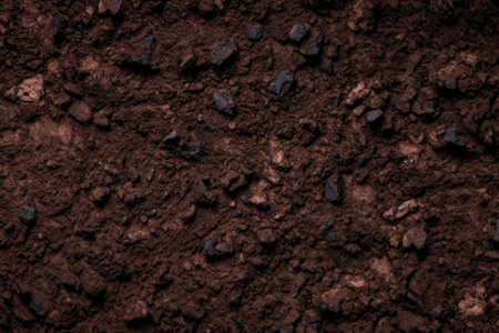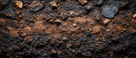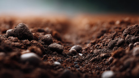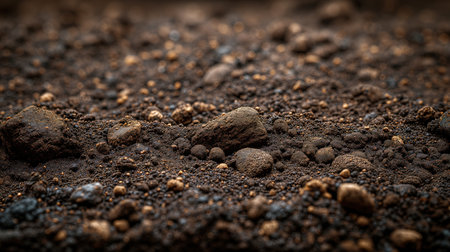 A detailed close-up image capturing the rich, dark texture of soil with visible organic particles, ideal for gardening and agricultural purposes. The soil appears moist and fertile, ready for planting. AI generated image