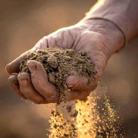 A close-up image capturing dust and soil particles rising from the ground, illuminated by soft sunlight, showcasing the essence of nature and agriculture.
