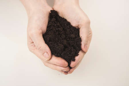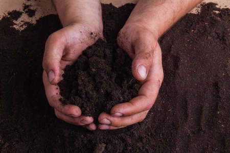 Close up of farmer hands holding soil in the garden. Selective focus.