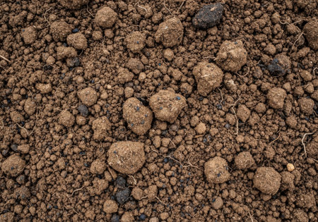 This image showcases a close-up view of rich brown soil, capturing texture and details that highlight natural components, making it ideal for agricultural or gardening themes.