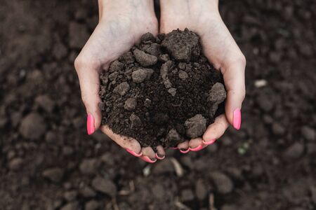 The girl holds the earth in her hands. Handful of Rich Brown Soil. Pink manicure.