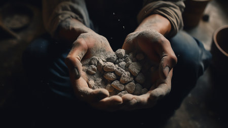 Pair of hands holding dirt covered ball, showcasing texture and earthiness of soil. image conveys sense of connection to nature and earth