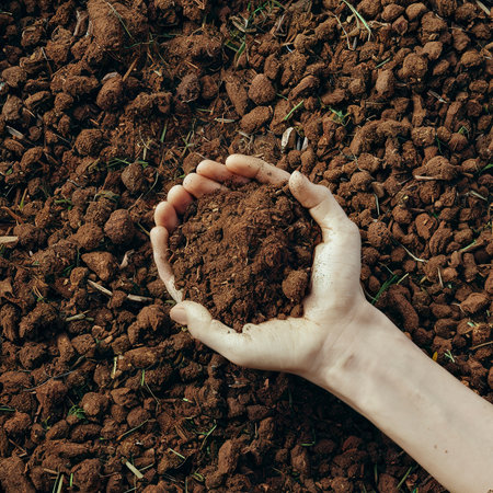 Close-up of farmer holding a pile of dark, fertile soil, emphasizing the importance of healthy soil for agriculture and sustainable farming practices