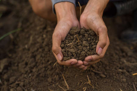 Hand holding soil,Hand dirty with soil on abstract blurred background.