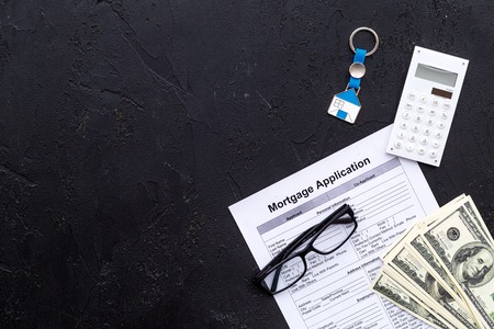 Housing loan. Draw up a mortgage. Mortgage application near keychain in shape of house and money on black background top view copy space