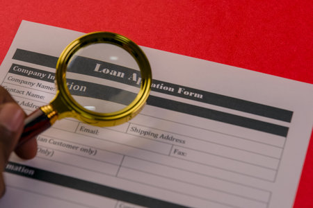 Hand holding a magnifying glass over a loan application form while examining details and personal information.
