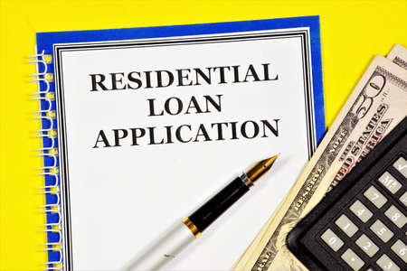 Application for a housing loan - text inscription on the planning form. Calculator for calculating, pen for signing a document.