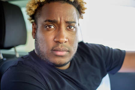Close-up of a confident, serious African American man in a T-shirt sitting in his car. A black man with an African hairstyle looks at the camera through the side window of the car