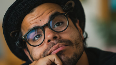 Close-up of a latin Mexican male deep in thought, sporting glasses and a hat.