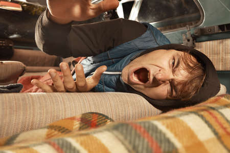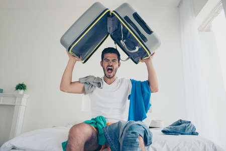 Handsome young bearded brunet evil crazy man wearing white t-shirt, sitting indoors on bed, packing luggage to a trip, journey, holding bag above head, shouting, room in mess