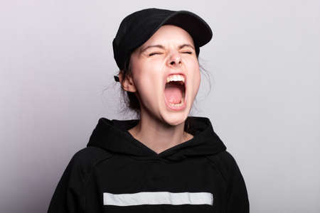 Young Adult with Curly Hair Showing Expression of Anger and Frustration Against Plain Background in Portrait Mode