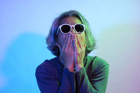 Amazed man. Offer banner. Omg expression. Advertising background. Shocked guy in bright red neon light isolated on black empty space header.