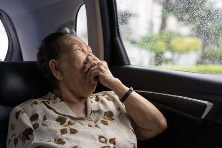 Elder Asian woman taking a seat in a car during raining outside. Wellness and healthcare in retired people. Mature senior woman traveling by the personal car while raining.