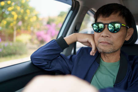 Asian senior adult man driver using left hand grabs on the steering wheel while driving on the road, old man driving a car. Asian old man wearing a sun glasses for better vision and safety driving.