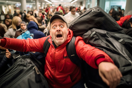 An emotional person is heading to a shopping mall with big Black Friday sales