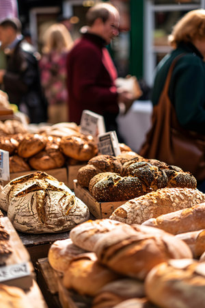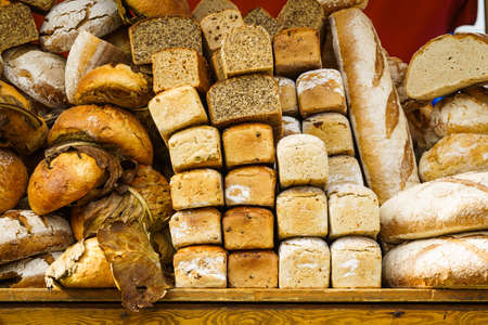 Many rustic baked traditional bread loaves on market stall outdoor.