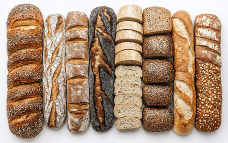 Premium bakery bread assortment featuring rustic sourdough, multigrain loaves, sesame baguettes, and artisan varieties. Perfect for food industry marketing, restaurant menus, and culinary content.