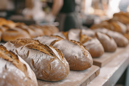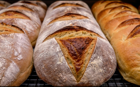 A close-up view of freshly baked artisan bread displayed in a rustic bakery setting, showcasing the unique textures and golden crusts that highlight natural ingredients.