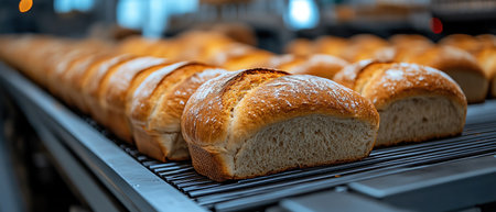 Freshly baked bread on a conveyor belt, moving through an industrial bakery
