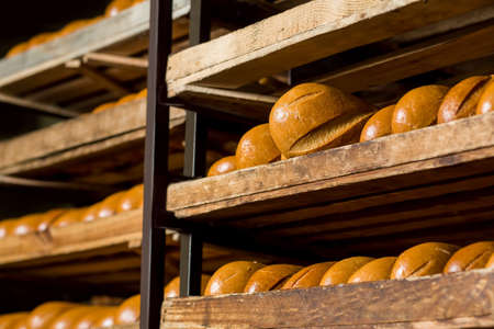Loaves of freshly baked bread placed on wooden shelves in bakehouse at daytime