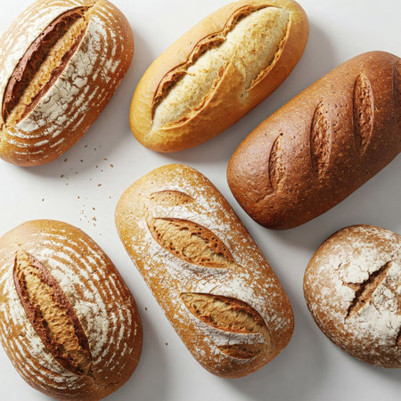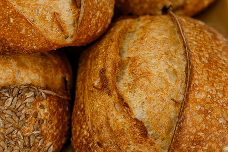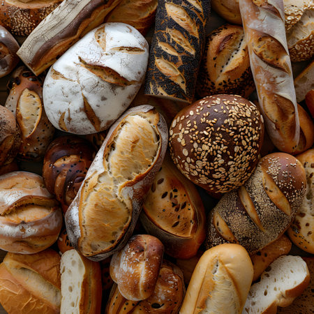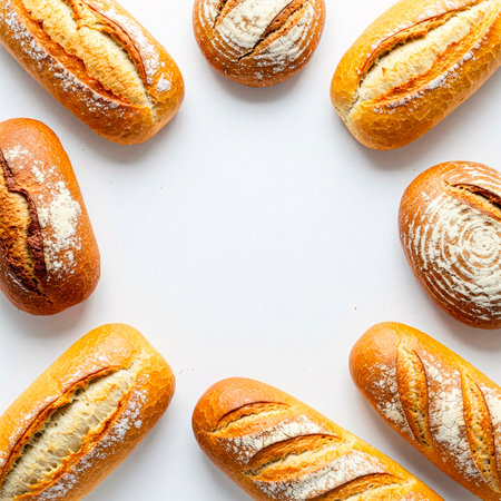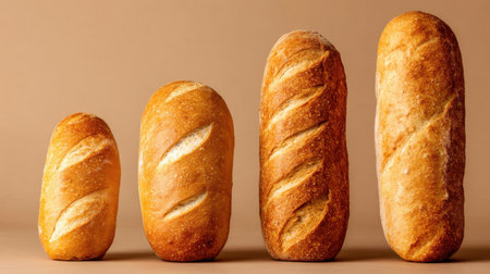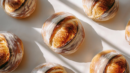 A stunning arrangement of freshly baked bread loaves showcasing their golden crust texture, perfect for culinary inspiration or food-related projects.
