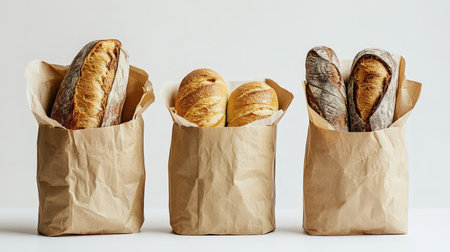 Freshly baked French baguettes neatly placed in eco kraft paper bags against a minimalist white background.