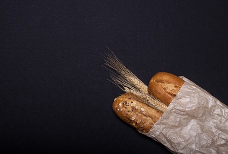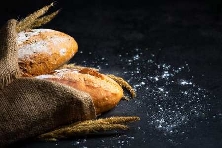 Assortment of fresh baked bread and rye on dark background with copy space