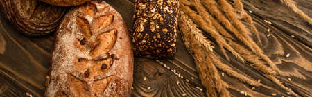 fresh baked bread loaves with spikelets on wooden surface, panoramic shot