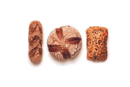 Freshly baked bread on white background. Top view. Copy space.