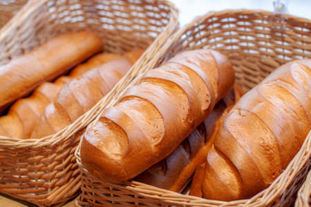 Fresh fragrant bread on the table. Food concept Wheat pastry