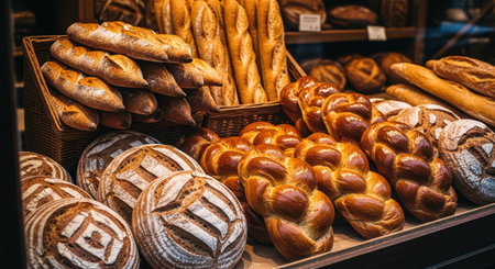 Assorted fresh breads in bakery display featuring rustic loaves and golden braids