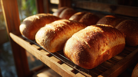 A collection of beautifully baked bread loaves resting on a wooden rack, illuminated by warm sunlight. The golden crust and rustic charm highlight the art of baking.
