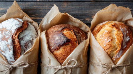 Delight in the sight of freshly baked artisan bread loaves wrapped in paper, perfect for showcasing culinary creations and enhancing any food presentation.