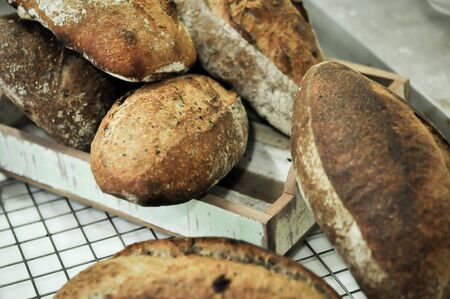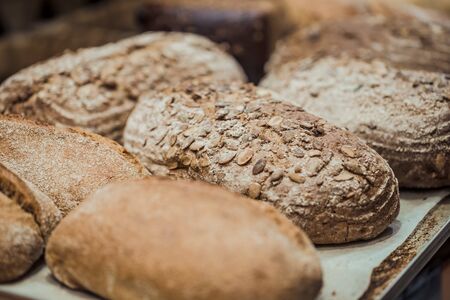 Concept of small bakery. Selective focus on fresh, crispy and perfect wholegrain bread lying on shelves with homemade loaves at kitchen