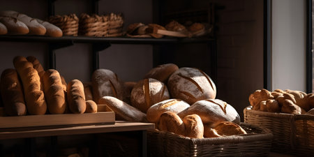 Loaves of fresh baked bread on the shelves of bakehouse. AI generated