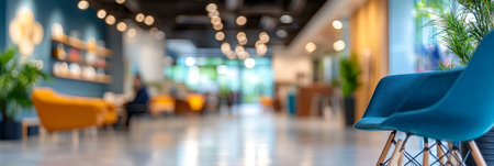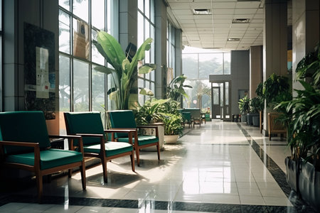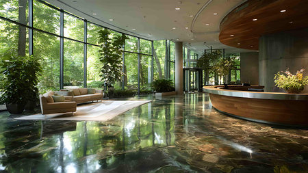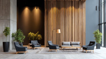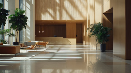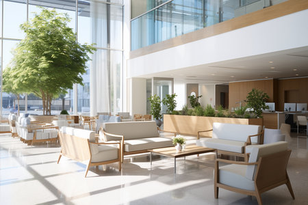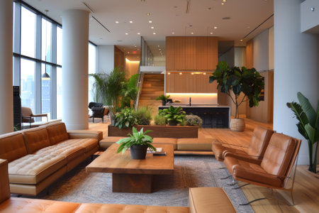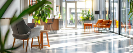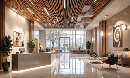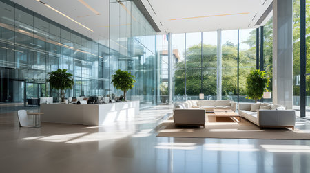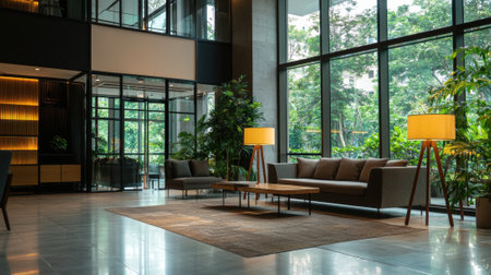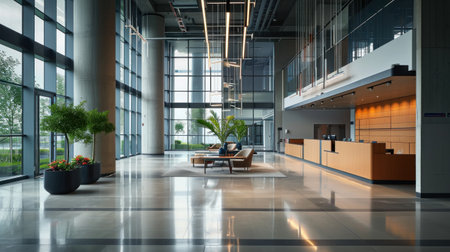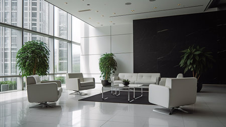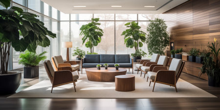 Spacious and stylish office lobby interior with comfortable seating and lush green plants enhancing the ambiance