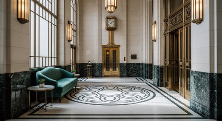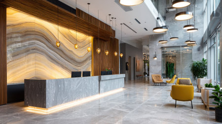 A sophisticated modern lobby showcasing exquisite marble surfaces, elegant lighting fixtures, and contemporary furniture that enhances the inviting atmosphere.