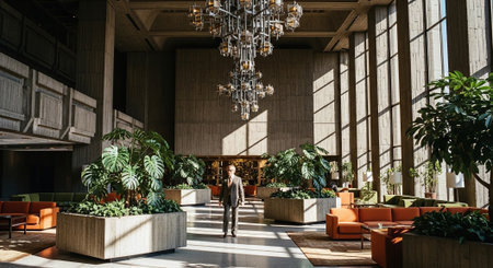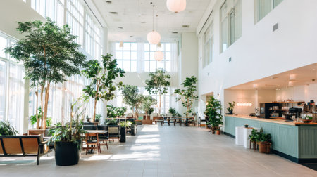 A spacious lobby showcases sleek furniture and lush greenery. Natural light floods the area through large windows, creating a welcoming atmosphere for guests.