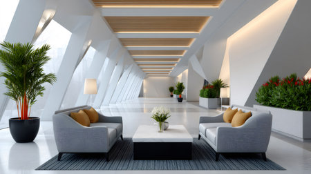 Contemporary lobby with stylish sofas, coffee table, and indoor plants in a sleek architectural space