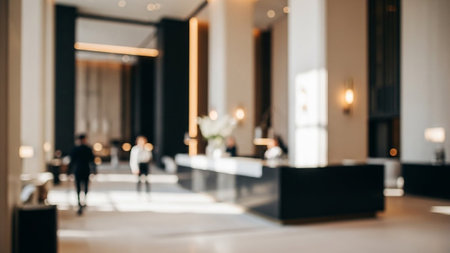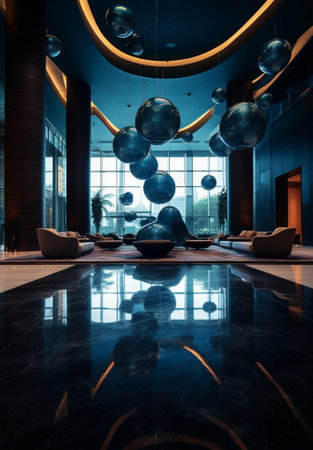 Interior lobby at luxury hotel. Scene is calm and relaxing
