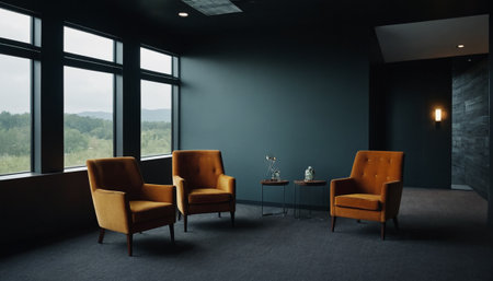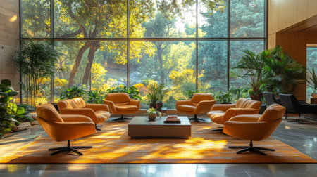 Cozy lounge area with modern orange chairs and natural light in a serene setting surrounded by greenery. Generative AI