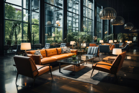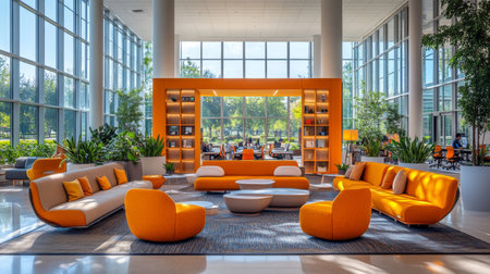 Modern Lounge With Vibrant Orange Furniture and Large Windows Allowing Natural Light in a Contemporary Setting. Generative AI