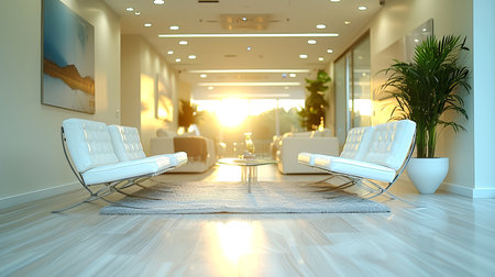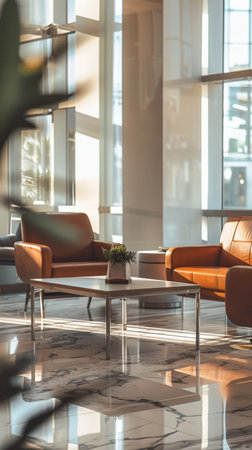Refined office lobby with minimalist chairs and coffee table, warm sunlight filtering through glass, soft tone gradient on polished surface, central negative space, brand-free