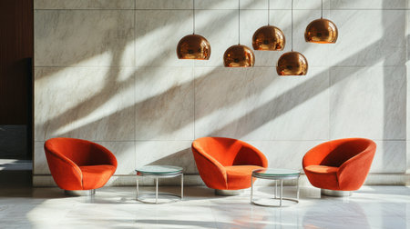 A modern lounge area featuring stylish orange chairs and elegant pendant lighting. This vibrant space is perfect for relaxation or casual meetings.