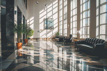 This elegant office lobby showcases modern design with natural light streaming through large windows, featuring stylish furniture and lush plants that enhance the ambiance.