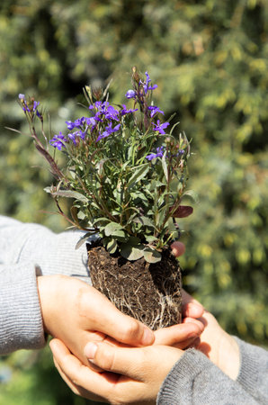 4 children's hands hold blooming flower with roots for planting it in open ground. Eco concept, spring sunny season, family gardening. earth day. Gardening with love. Botany lesson for children.