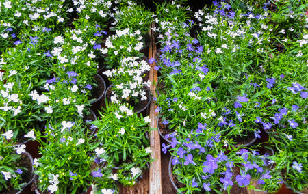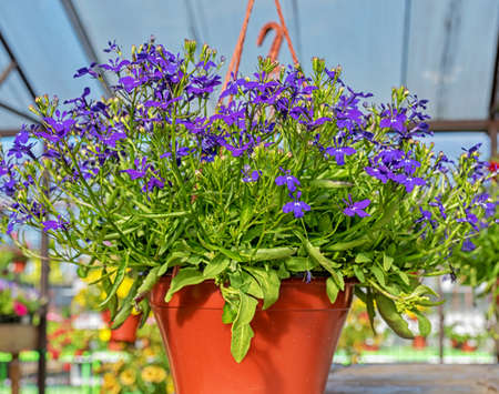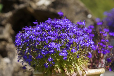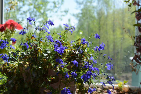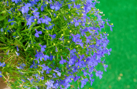 Blue flowers of Garden lobelia (Lobelia erinus L.) planted in flower garden container