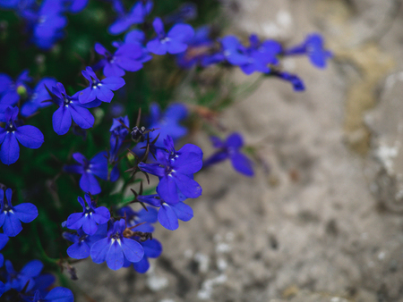Blue Trailing Lobelia flowers close up shot. Alpine herbs in full bloom. Floral background